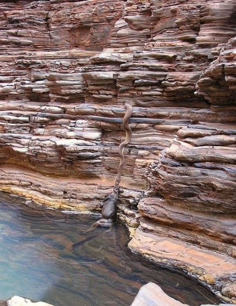 Nehirden ufak kanguruları çıkartan pitonlar