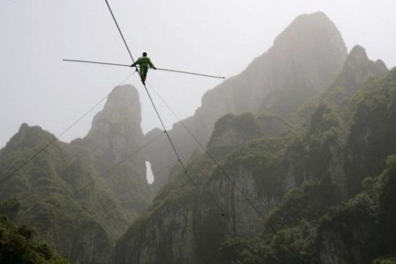 Samat Hasan uçsuz bir boşlukta 700 metre uzunluğunda 3.1 santimetre kalınlığında bir ipte yürüyor.