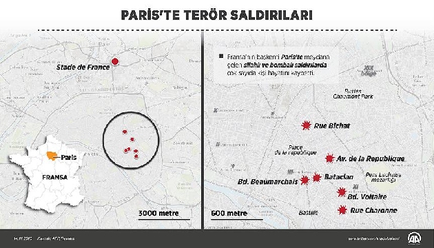 Paris'i kana bulayan saldırılarda en fazla can kaybı, ilk belirlemelere göre 100'e yakın kişinin öldüğü Bataclan konser salonunda yaşandı. Polis, konser salonu içindekileri rehin alan saldırganları ölü ele geçirdi.