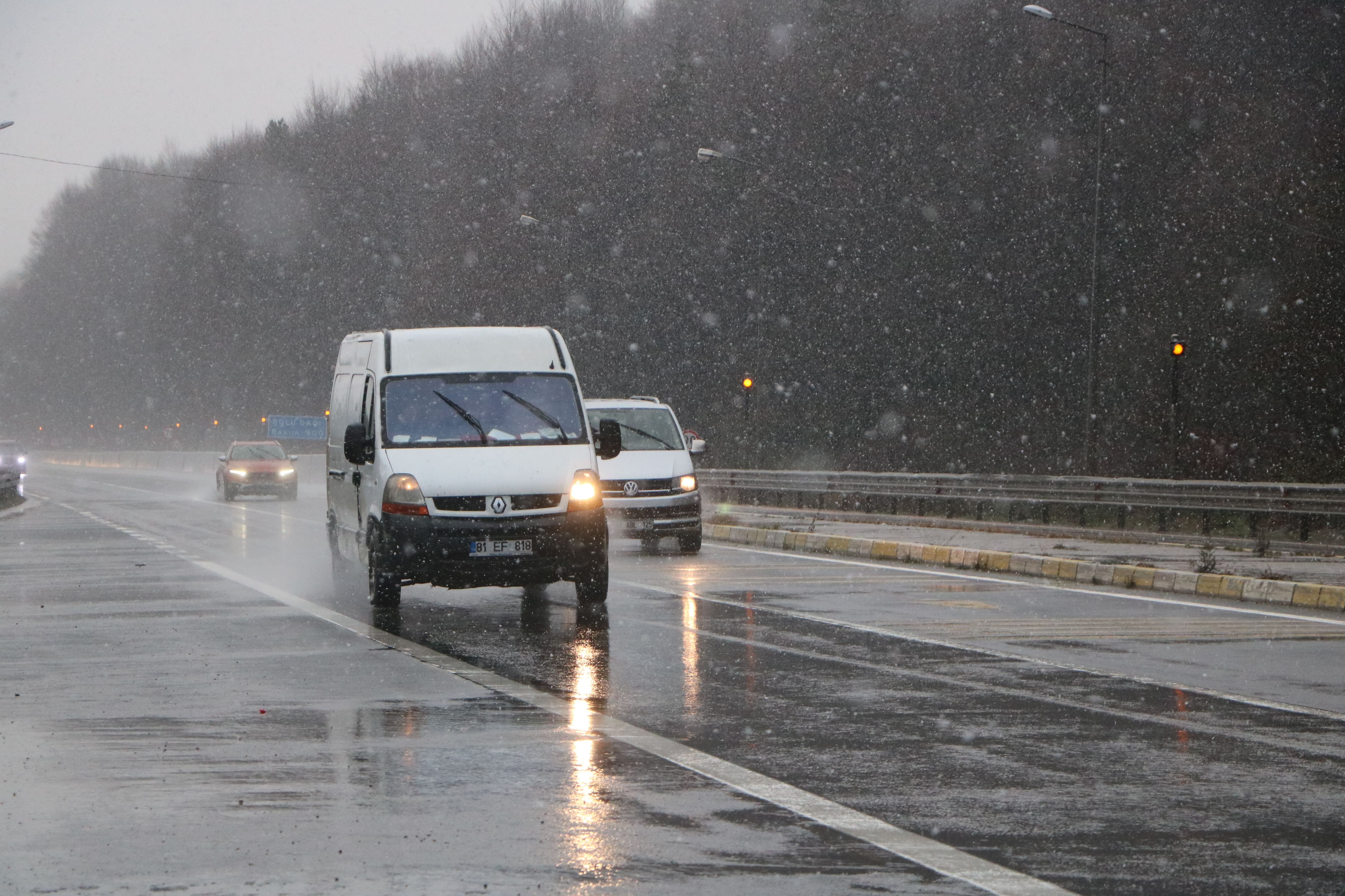 Kara yolunun Abant Kavşağı, Bakacak, Karanlıkdere ve Seymenler mevkilerinde gece etkili olan yağmur, sabah saatlerinde yerini kar yağışına bıraktı.
