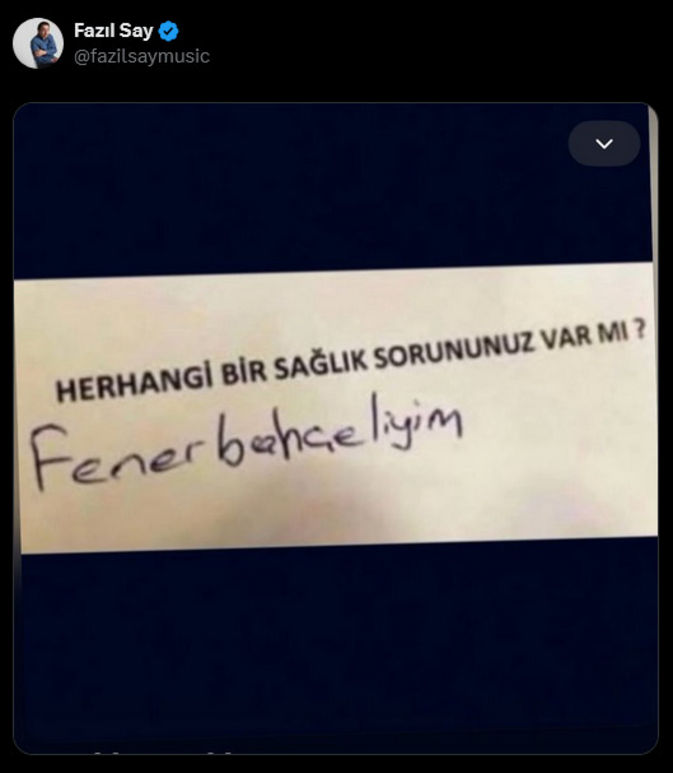 Dünyaca ünlü piyanist, X hesabından yaptığı paylaşımda, "Herhangi bir sağlık sorununuz var mı?" sorusuna "Fenerbahçeliyim" yanıtını verdiği görseli verdi.