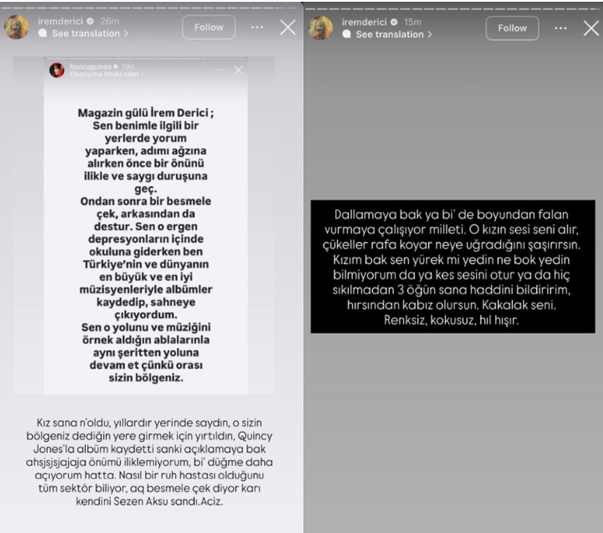 İrem Derici ise kendisine cevap veren Burcu Güneş'in paylaşımı üzerine sert sözler sarfetti.