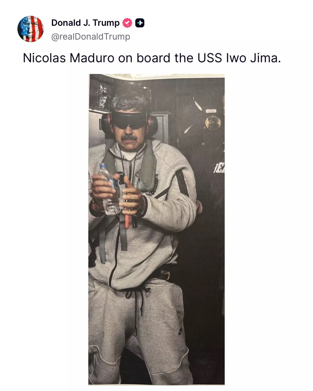 Truth Social sosyal medya hesabından paylaştığı fotoğrafta Maduro'nun gözlerinin bağlı ve ellerinin kelepçeli olduğu görüldü.