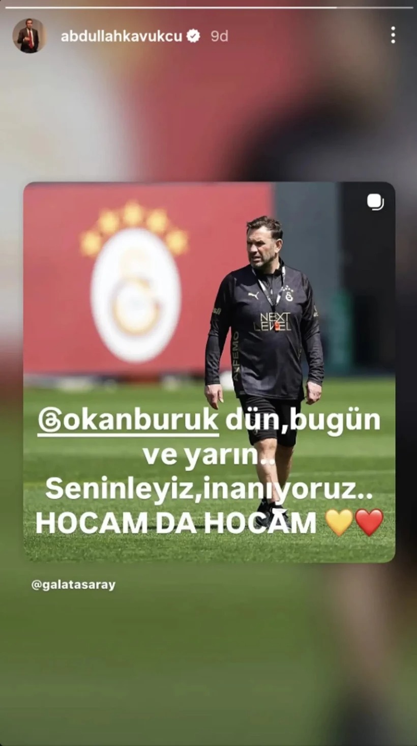 Galatasaray Başkan Vekili Abdullah Kavukcu, şahsi sosyal medya hesabı üzerinden Okan Buruk ile çekilmiş bir görsel paylaşarak desteğini ilan etti. Kavukcu mesajında, "Dün, bugün ve yarın. Seninleyiz, inanıyoruz. Hocam da hocam…" ifadelerini kullanarak, yönetim kurulunun Okan Buruk ile uzun vadeli çalışma iradesini ve şampiyonluk yolundaki inancını ortaya koydu.