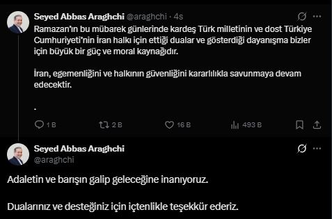 İran Dışişleri Bakanı Abbas Arakçi, mesajında Türkiye ve İran arasındaki tarihi ve kültürel bağlara dikkat çekti. Ramazan ayının manevi atmosferine vurgu yapan Arakçi, "Kardeş Türk milletinin ve dost Türkiye Cumhuriyeti’nin İran halkı için ettiği dualar ve gösterdiği dayanışma bizler için büyük bir güç ve moral kaynağıdır" ifadelerini kullandı.
