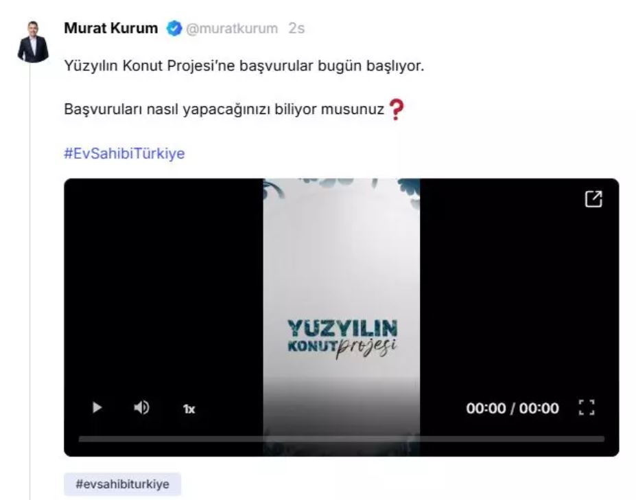 Bakan Kurum, NSosyal hesabından yaptığı paylaşımda, "Yüzyılın Konut Projesi'ne başvurular bugün başlıyor. Başvuruları nasıl yapacağınızı biliyor musunuz?" ifadelerini kullandı.