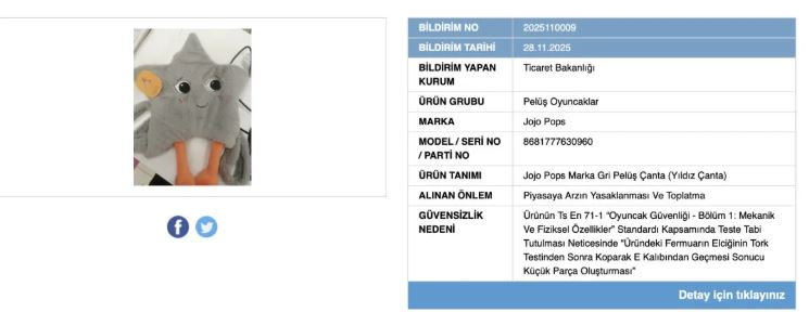İncelemelerde, Jojo Pops marka gri pelüş çantanın boğulma tehlikesi oluşturduğu belirlendi.