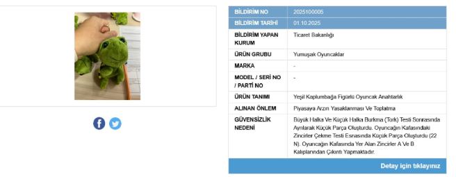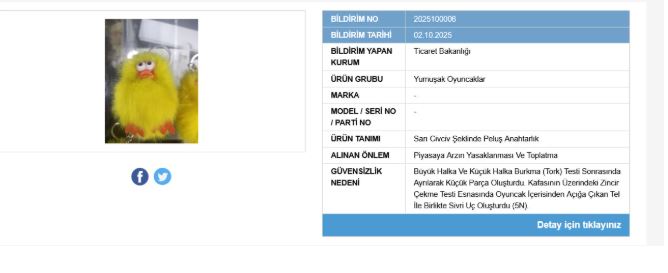 Çalışma ve Sosyal Güvenlik Bakanlığı’nın bildirimine göre, sarı civciv figürlü anahtarlık kullanım açısından riskli bulundu. Yapılan testler sonucunda ürünün güvensiz olduğu belirlenerek satışının yasaklanmasına ve piyasadan toplatılmasına karar verildi.