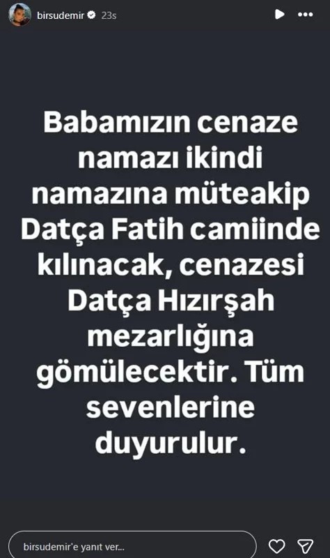 Acı haberi sosyal medya hesabından duyuran Demir, babasının Datça'da toprağa verildiğini paylaştı.