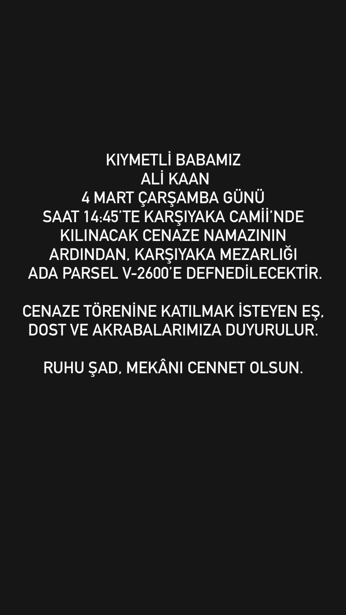 Bankacı ve Türk Demokrasi Vakfı Genel Sekreteri Nur Kaan’ın babası Ali Kaan vefat etti. Cenaze namazı yarın (4 Mart Çarşamba günü saat 14: 45'te) Karşıyaka Camii'de kılınacaktır. İlgi takdirinize.