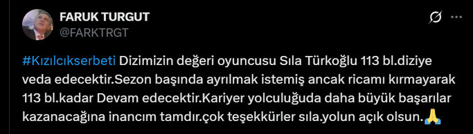 Turgut, açıklamasında şunları kaydetti; "Kızılcık Şerbeti dizimizin değerli oyuncusu Sıla Türkoğlu, 113'üncü bölümde diziye veda edecektir. Sezon başında ayrılmak istemiş, ancak ricamı kırmayarak 113'üncü bölüme kadar devam etti. Kariyer yolculuğunda daha büyük başarılar kazanacağına inancım tamdır. Çok teşekkürler Sıla, yolun açık olsun."