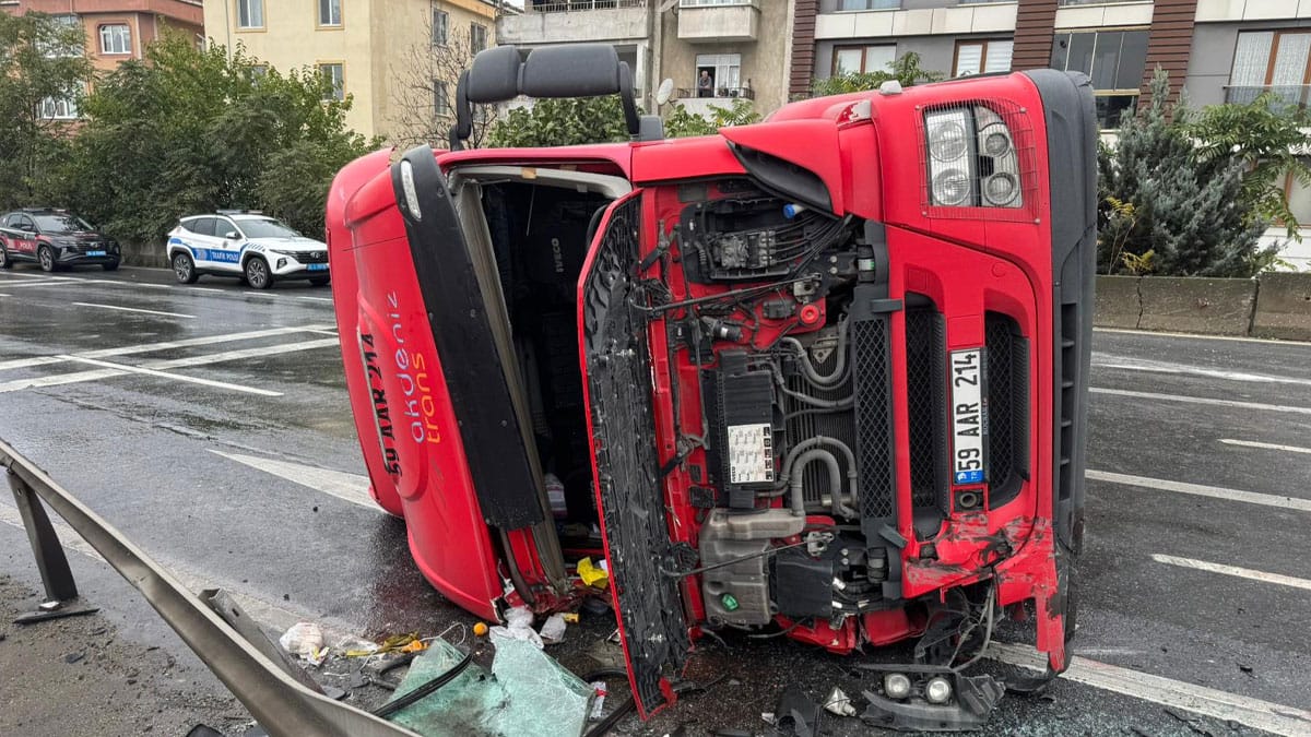 D-100 kara yolu Edirne istikametinde seyir halinde olan TIR, Büyükçekmece mevkisinde yağışın etkisiyle kayganlaşan yolda, kontrolden çıkarak devrildi.