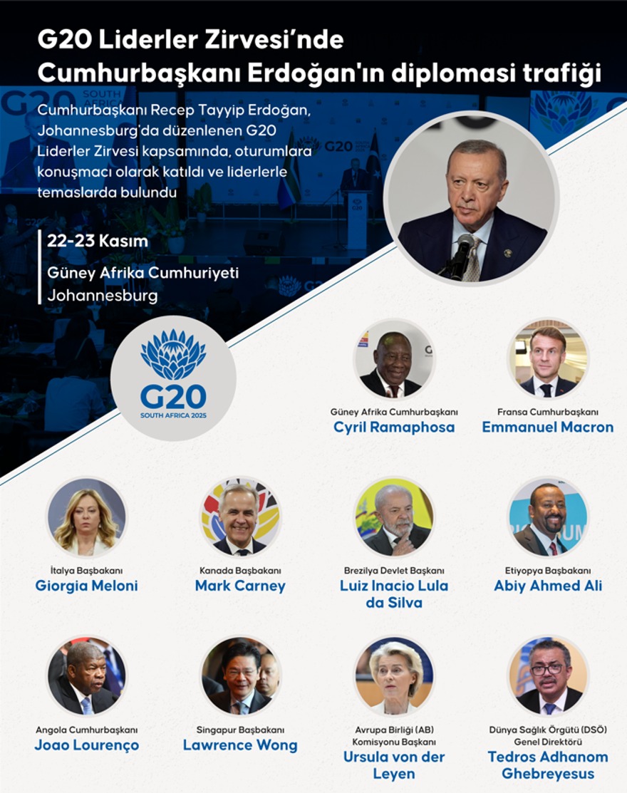 Erdoğan, 22-23 Kasım'daki G20 Liderler Zirvesi'ne katılmak için Güney Afrika Cumhuriyeti'nin Johannesburg kentine gitti.