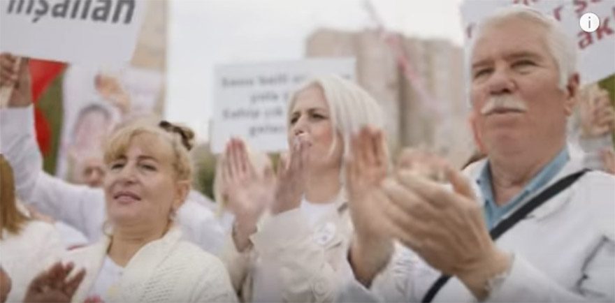 Seyfi Erol, reklam filminin bir kısmında açık havada bir mitingde alkış yaparken görülüyor.