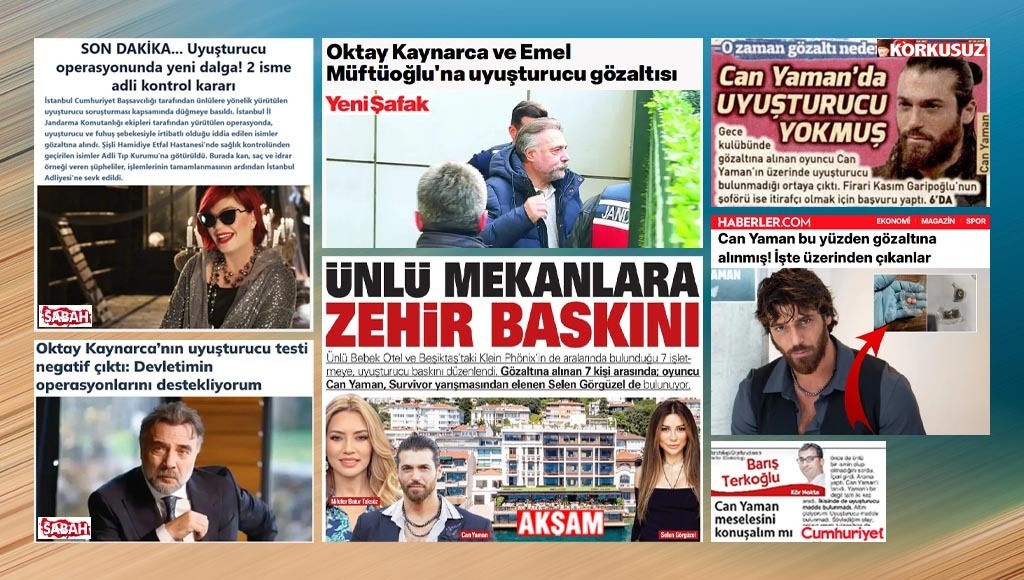 “Ünlü mekânlara zehir baskını” haberlerinde oyuncu Can Yaman’ın da “uyuşturucu ve uyarıcı madde kullanma” suçlamasıyla gözaltına alındığı duyuruldu. Akşam, Hürriyet, Milliyet, Sözcü gazeteleri ile Ülke TV, Ensonhaber, Haberler, İnternethaber gibi bazı haber sitelerinde Can Yaman’ın üzerinde uyuşturucu bulunduğu belirtildi.