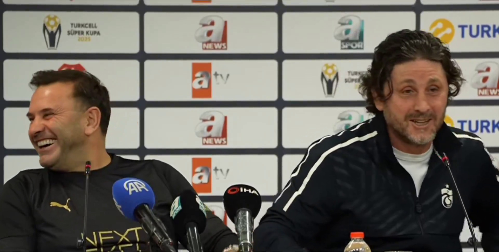 Galatasaray Teknik Direktörü Okan Buruk ve Trabzonspor Teknik Direktörü Fatih Tekke'nin Süper Kupa maçı öncesi düzenledikleri ortak basın toplantısına, aralarındaki güldüren diyalog damga vurdu.