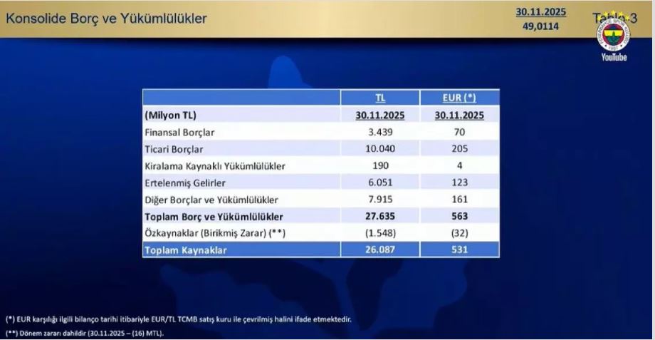 Vodina, Sarı-lacivertli kulübün toplam yükümlülüğünün ise 27 milyar 635 milyon lira olduğunu açıkladı.
