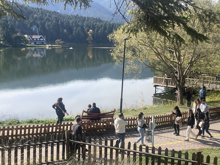 Göl çevresinde yürüyüş yapan, fotoğraf çeken ve piknik alanlarında zaman geçiren ziyaretçiler, sonbahar manzarasının tadını çıkardı.