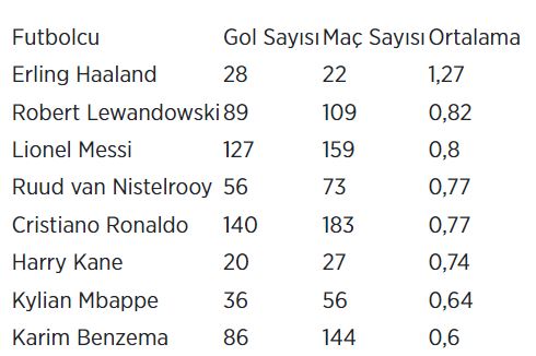 Şampiyonlar Ligi'nde 27'şer golü bulunan Rivaldo ve Luis Suarez'i geride bırakan Haaland, gol ortalamasıyla organizasyon tarihine damga vurmuş Cristiano Ronaldo, Lionel Messi ve Robert Lewandowski gibi yıldızların üzerine yerleşti.