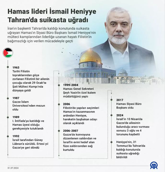Hamas lideri İsmail Haniye, İran'ın başkenti Tahran'da kaldığı konutunda uğradığı saldırıda şehit oldu. Haniye, dün İran Meclisi'nde düzenlenen 9'uncu Cumhurbaşkanı Mesud Pezeşkiyan'ın yemin törenine katılmıştı.