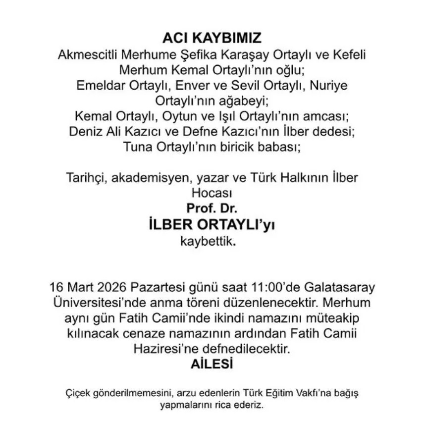 Ortaylı’nın ailesi, 13 Mart 2026’daki vefatın ardından yaptıkları açıklamada şu ifadeleri kullandı: