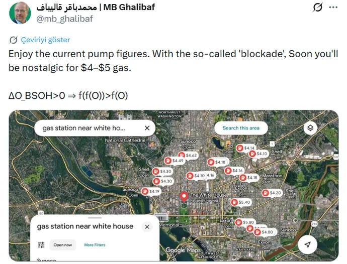 İran’ın stratejik hamlelerine ve ABD’nin yaptırım kararlarına ilişkin değerlendirmelerde bulunan Galibaf, özellikle Batı kamuoyuna ve küresel piyasalara hitap eden sert bir uyarıda bulundu. Mevcut benzin fiyatlarının "tadının çıkarılması" gerektiğini belirten Galibaf, abluka nedeniyle yaşanacak tedarik zinciri kırılmalarının ardından 4-5 dolarlık galon/litre fiyatlarının bile ulaşılamaz hale geleceğini öne sürdü.