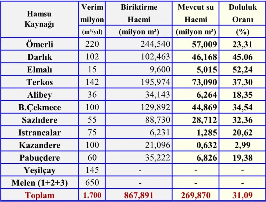 İSKİ verilerine göre, İstanbul’un 11 barajında su seviyeleri alarm veriyor. Kazandere Barajı’nda doluluk oranı yüzde 2,99’a kadar geriledi. Alibey Barajı yüzde 18,35, Pabuçdere Barajı yüzde 19,38, Ömerli Barajı yüzde 23,31 seviyesinde bulunuyor. Doluluk oranı en yüksek baraj ise yüzde 52,24 ile Elmalı Barajı oldu. İstanbul genelinde toplam mevcut su hacmi 269 milyon 870 bin metreküp olarak ölçüldü.