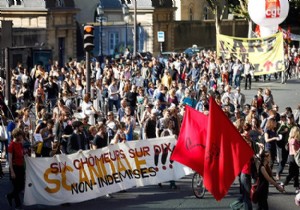 Paris'te Çalışma Bakanlığının önünde toplanan yüzlerce gösterici "Kemer sıkmaya karşı birlik olalım", "10 işsizden 6'sına ödeme yok, skandal" sloganlarıyla Kültür Bakanlığına kadar yürüdü.