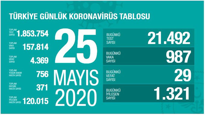 Güncel korona virüsü salgını verilerine göre bugün 21 bin 492 test yapıldı ve bu testlerden 987 yeni vaka tespit edildi. Türkiye’deki toplam vaka sayısı 157 bin 814’e yükselmiş oldu.