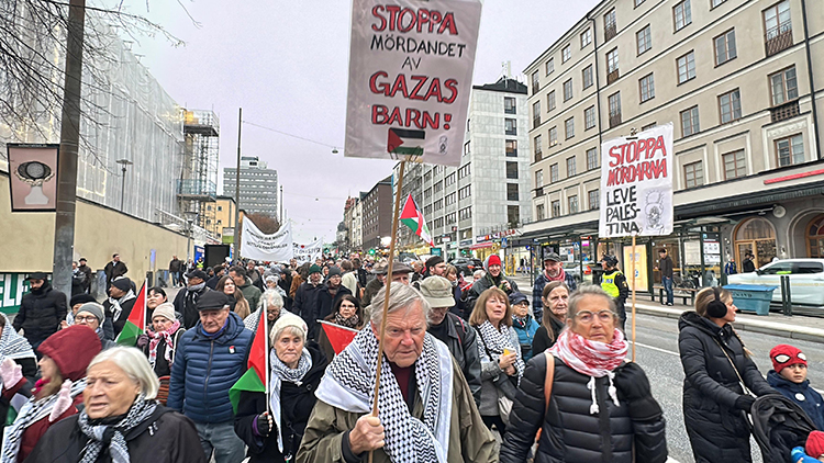 "Gazze'de çocuklar öldürülüyor", "Okullar ve hastaneler bombalanıyor", "Lübnan'a saldırı durdurulsun" ve "Gıda kıtlığına son verilsin" yazılı pankartlar taşıyan topluluk, İsrail'in Gazze'ye yönelik soykırımı ve Lübnan'a yapılan hava saldırısını durdurmasını ve İsveç'in İsrail'e silah satışına son vermesini talep etti.