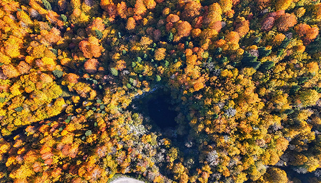Sarı ve kahverengi tonlara bürünen mağara ve çevresi dronla görüntülendi.