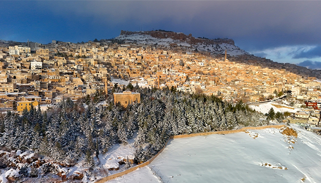 Kar yağışıyla beyaza bürünen Mardin Kalesi, Olgunlaşma Enstitüsü, Zinciriye Medresesi ile birçok cami ve kilise gibi kentin tarihi ve kültürel mekanları güzel görüntüler oluşturdu.