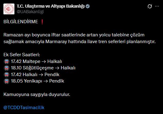“Ramazan ayı boyunca iftar saatlerinde artan yolcu talebine çözüm sağlamak amacıyla Marmaray hattında ilave tren seferleri planlanmıştır. Ek seferler, saat 17.42’de Maltepe’den Halkalı’ya, saat 18.10’da Söğütlüçeşme’den Halkalı’ya, saat 17.42’de Halkalı’dan Pendik’e ve saat 18.05’te Yenikapı’dan Pendik’e olacak şekilde düzenlenmiştir.”