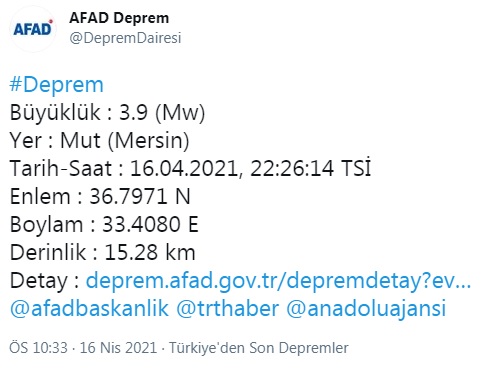 Afet ve Acil Durum Yönetimi Başkanlığı (AFAD) Deprem Dairesi Başkanlığı verilerine göre saat 22.26'da merkez üssü Mersin'in Mut ilçesinde 3.9 büyüklüğünde deprem kaydedildi.