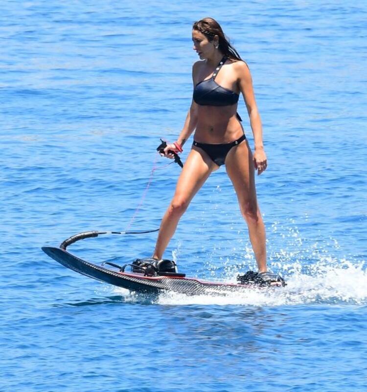 Fit fiziği ile dikkat çeken Oflaz, gün boyu su üstünde havalanan elektrikli sörf tahtası ile eğlenceli anlar yaşadı.