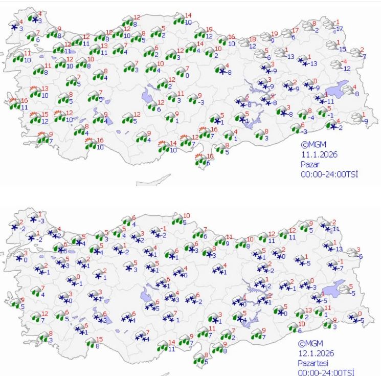Akşam saatlerinde etkili olması beklenen kuvvetli sağanağın, sıcaklıkların 6-7 derece birden düşmesiyle birlikte kara dönüşeceği; pazartesiden itibaren ise yurdun büyük bölümünde kar yağışının etkili olacağı bildirildi.
