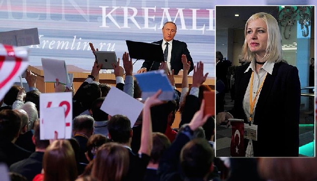 Gazetecilerin söz alabilmek için ellerinde küre, döviz taşıdığı, atkı, flama salladığı Rusya Devlet Başkanı Vladimir Putin'in yıllık değerlendirme toplantısında, Anadolu Ajansı (AA) muhabiri Elena Teslova, elinde Türk bayrağıyla soru sordu.