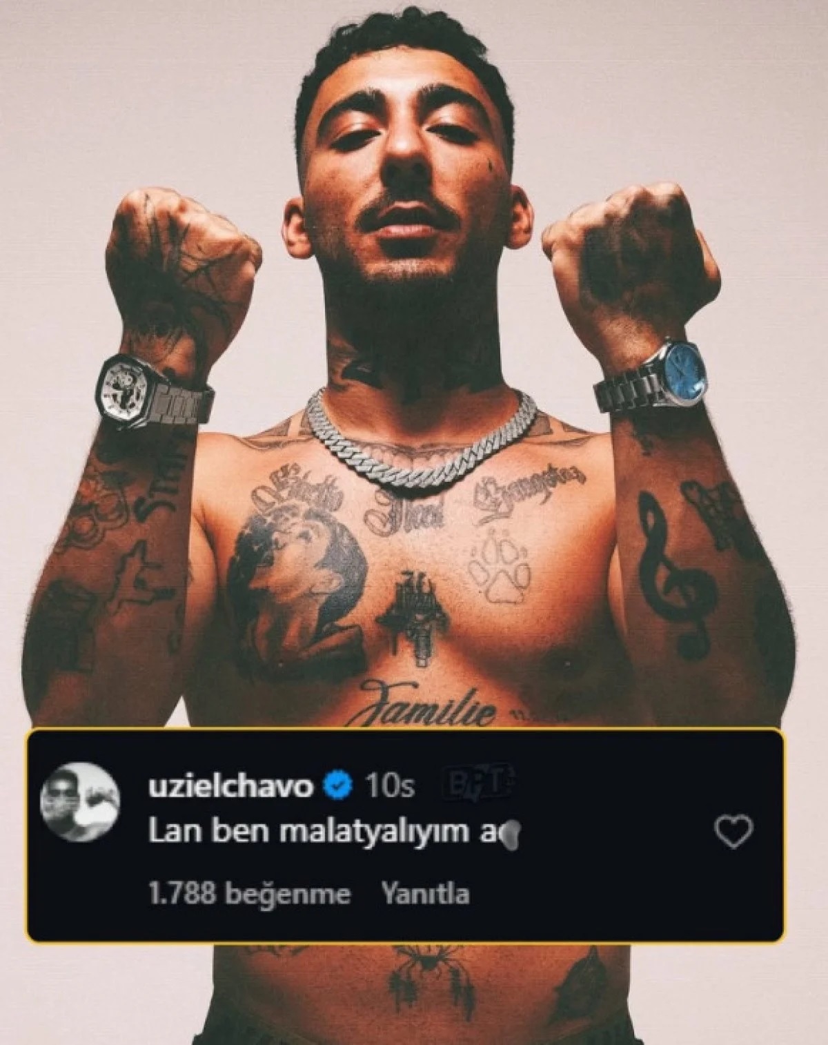 Bu iddialara Instagram hesabı üzerinden cevap veren Uzi, paylaştığı mesajda “Malatyalı” olduğunu vurgulayarak suçlamalara tepki gösterdi. Tepkisini sert bir üslupla dile getiren rapçi, açıklamasında küfürlü ifadeler de kullandı.