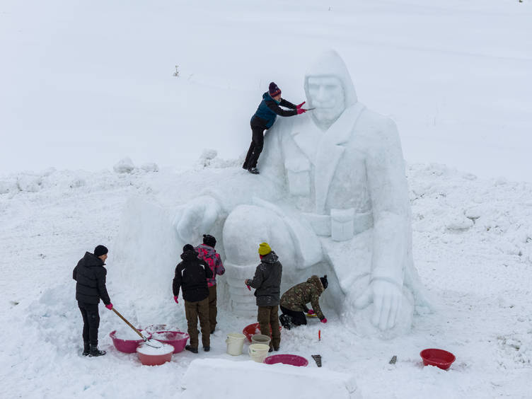 Kızılçubuk mevkisinde yapılan kardan heykelde çalışmalar tamamlandı, oteller bölgesinde ise devam ediyor.