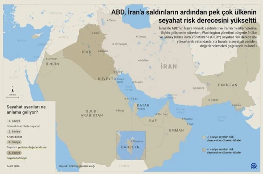İsrail ile ABD'nin İran'a yönelik saldırıları ve İran’ın misillemelerine ilişkin gelişmeler sürerken Washington yönetimi, bölgede 9 ülke ve Güney Kıbrıs Rum Yönetimi'ne (GKRY) seyahat risk derecesini yükselterek vatandaşlarına buralara seyahati yeniden değerlendirmeleri çağrısında bulundu.