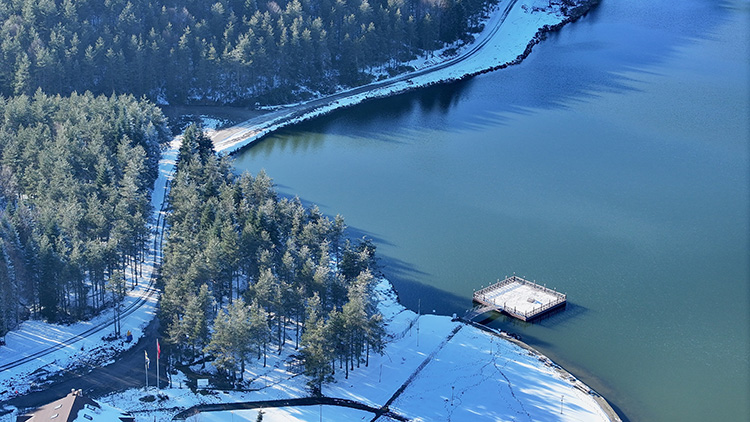 Güneşin de yüzünü gösterdiği yayla ve çevresinin karla kaplı görüntüsü havadan görüntülendi.