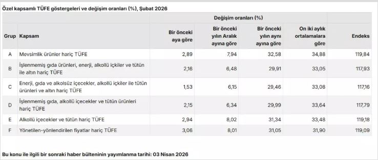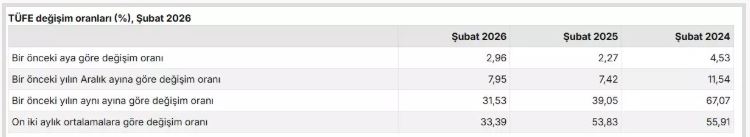 Ekonomistlerin beklentisi şubat ayında TÜFE'nin yüzde 2,87 oranında artması, yıllık bazda ise yüzde 31,42 seviyesine çıkması yönündeydi. Öte yandan, ekonomistlerin 2026 sonu enflasyon beklentilerinin ortalaması şubat ayı itibarıyla yüzde 24,16 oldu.