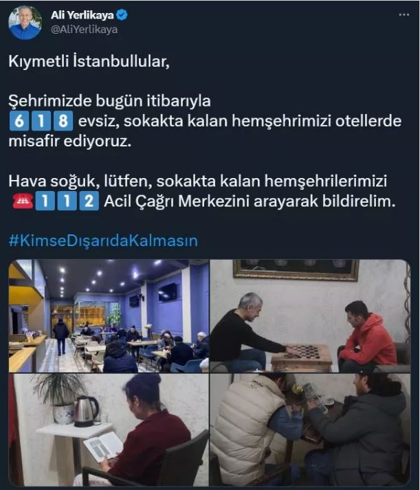 Kıymetli İstanbullular, Şehrimizde bugün itibarıyla 618 evsiz, sokakta kalan hemşehrimizi otellerde misafir ediyoruz. Hava soğuk, lütfen, sokakta kalan hemşehrilerimizi 112 Acil Çağrı Merkezini arayarak bildirelim.