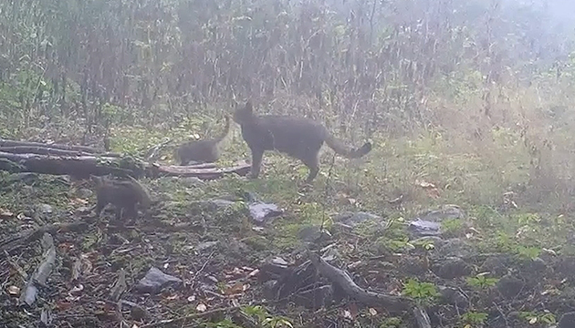 Ormana kurulan fotokapan tarafından kaydedilen görüntülerde, anne yaban kedisi ve yavrularının sisli havada ormanda yürüdüğü anlar yer aldı.