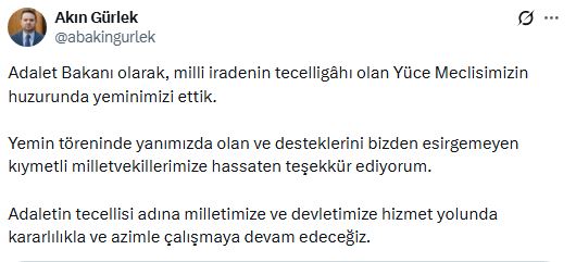 Yemin töreni sırasında yaşanan tartışmaların ardından X hesabından paylaşım yapan Gürlek, Meclis’te ettikleri yemine vurgu yaptı. Açıklamasında, “Adalet Bakanı olarak, milli iradenin tecelligâhı olan Yüce Meclisimizin huzurunda yeminimizi ettik” ifadelerini kullandı.