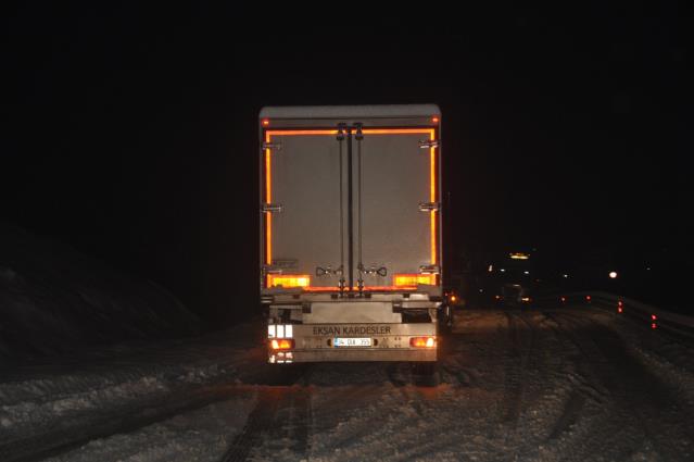 Kar yağışı ve tipi nedeniyle onlarca araç yolda mahsur kalırken, bazı tırlar ise yoldan çıkarak kara saplandı.