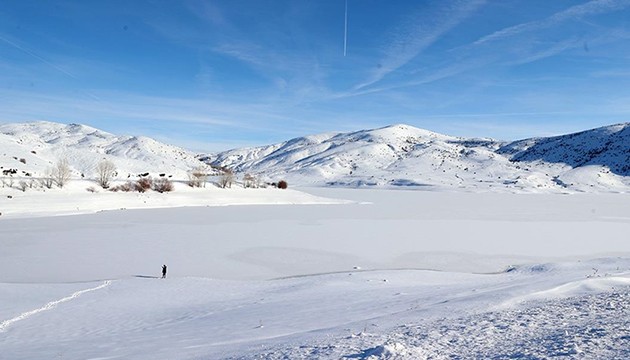 Sivas'ta soğuk hava nedeniyle Yıldız Göleti'nin yüzeyi buzla kaplandı.